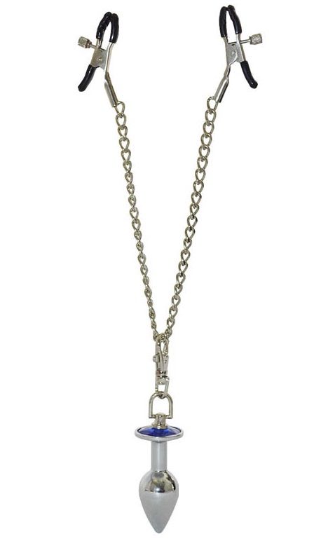 Зажимы для сосков с анальной пробкой - это девайс, с помощью которого вашей фантазии не будет предела, а так же подарит вам приятные ощущения сладкой боли. Зажимы оснащены пружинным механизмом, за счет чего легко и удобно фиксируются на месте, винтики позволяют отрегулировать степень давления в соответствии с индивидуальными предпочтениями. Длина цепочек - 15 см. Диаметр анальной пробки - 2,6 см. Важно: цвет кристалла может отличаться от фото!