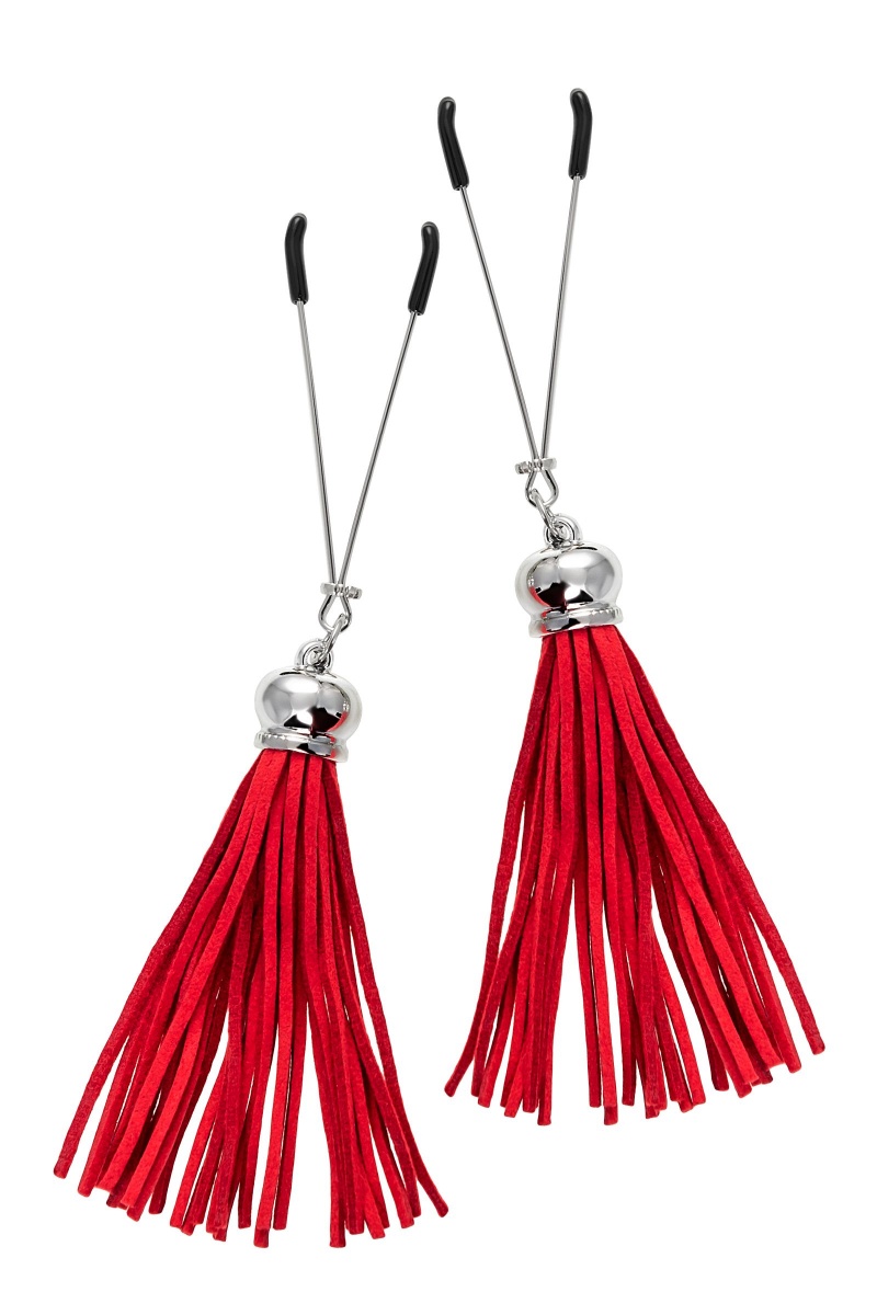 Попробуйте новые, дерзкие ощущения глубокого наслаждения! Зажимы-вилки от Pecado гарантируют смешение ярких чувств от тактильного контакта с нежной кожей сосков. Зажимы выполнены из высококачественных материалов. Металлическая часть компактная, приятная на ощупь. На концах черные резиновые наконечники, для безопасного воздействия на эрогенные зоны. Интенсивность сжатия аксессуара регулируется миниатюрными колечками. В зависимости от личных предпочтений и сценария игры, можно выбрать легкое пощипывание, или сильное сдавливание. Бахрома из натуральной замши, в насыщенном красном цвете, добавляет манящую красоту смелому атрибуту. При каждом соблазнительном покачивании груди, кисточки движутся в пикантном ритме. Также подходит для стимуляции и возбуждении в области половых губ и клитора.