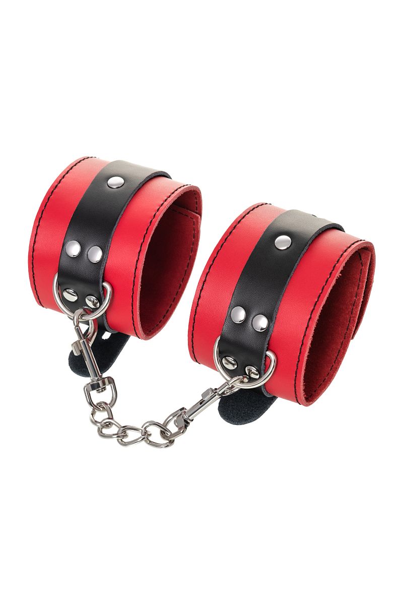 Оковы на ноги - волнующий воображение аксессуар, ведь это способ зафиксировать ноги партнера и получить полный доступ к его телу. Оковы из мягкой натуральной кожи сочетают в себе элементы, возбуждающие страсть и фантазию: красный и черный цвета и отделка металлическими элементами. В них будет комфортно подчиняться и ощущать ограничение свободы действий. Не натирают и имеют надежную степень фиксации. Размер легко регулируется металлической пряжкой. С помощью металлической цепочки и карабинов можно фиксировать ноги вместе, либо дополнить игру цепочкой и сковать ноги в широко разведенном положении. Длина манжет - 28 см., ширина - 6 см. Длина сцепки - 15,5 см.